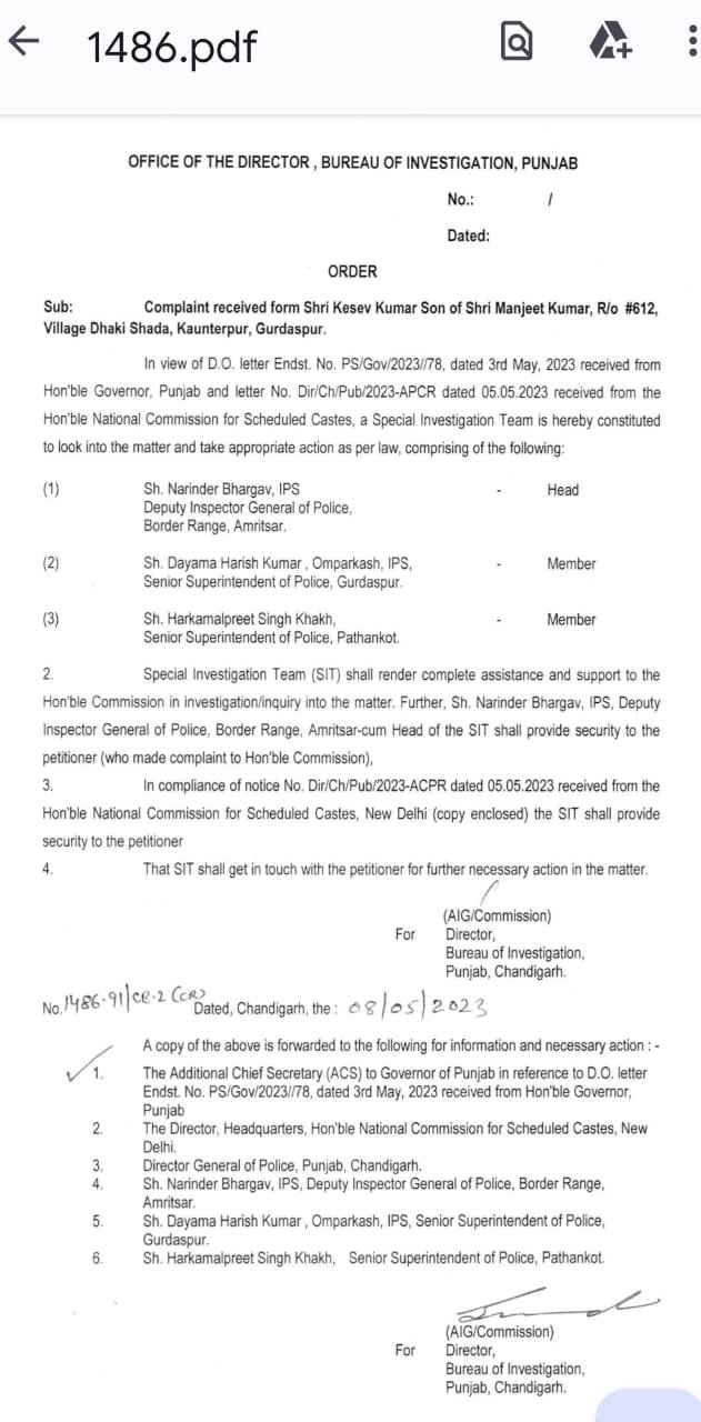 ਇਥੇ ਇਹ ਵੀ ਦਸ ਦਈਏ ਕਿ ਇਸ ਕਥਿਤ ਵੀਡੀਓ ਮਾਮਲੇ ’ਚ ਸ਼ਿਕਾਇਤਕਰਤਾ ਨੇ ਕੌਮੀ ਐੱਸ. ਸੀ. ਕਮਿਸ਼ਨ ਨੂੰ ਸ਼ਿਕਾਇਤ ਕੀਤੀ ਸੀ ਜਿਸ ਤੋਂ ਬਾਅਦ ਐੱਸ. ਸੀ. ਕਮਿਸ਼ਨ ਨੇ ਪੰਜਾਬ ਦੇ ਮੱਖ ਸਕੱਤਰ ਅਤੇ ਡੀ. ਜੀ. ਪੀ. ਨੂੰ ਨੋਟਿਸ ਜਾਰੀ ਕੀਤਾ ਸੀ। ਉਸੇ ਸ਼ਿਕਾਇਤਕਰਤਾ ਦੀ ਸ਼ਿਕਾਇਤ ’ਤੇ ਇਹ SIT ਦਾ ਗਠਨ ਕੀਤਾ ਗਿਆ ਹੈ ਅਤੇ ਇਹ ਵੀ ਜਾਣਕਾਰੀ ਮਿਲੀ ਹੈ ਪੁਲਿਸ ਵਲੋਂ ਬਣਾਈ ਗਈ SIT ਸ਼ਿਕਾਇਤਕਰਤਾ ਨੂੰ ਸੁਰੱਖਿਆ ਵੀ ਦੇਵੇਗੀ।