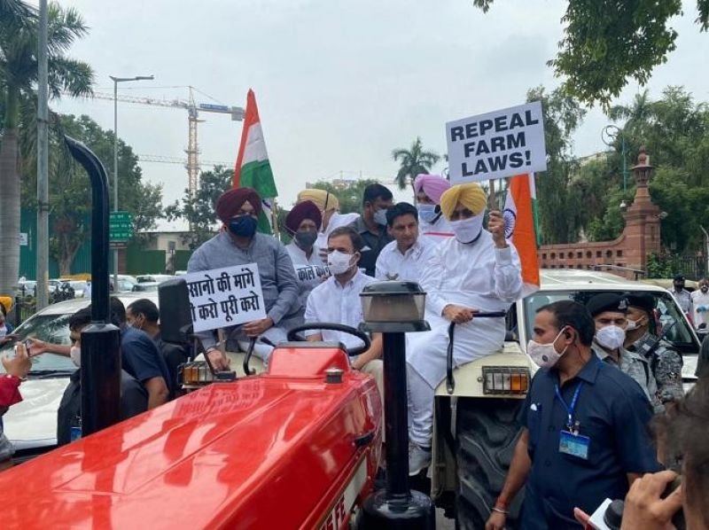 ਅੱਜ ਸੰਸਦ ਦੇ ਮਾਨਸੂਨ ਇਜਲਾਸ ਤੋਂ ਪਹਿਲਾਂ ਸਾਬਕਾ ਕਾਂਗਰਸ ਪ੍ਰਧਾਨ ਰਾਹੁਲ ਗਾਂਧੀ ਟਰੈਕਟਰ ਚਲਾ ਕੇ ਸੰਸਦ ਭਵਨ ਪਹੁੰਚੇ। ਇਸ ਮੌਕੇ ਉਹਨਾਂ ਨਾਲ ਰਣਦੀਪ ਸੁਰਜੇਵਾਲਾ, ਦਪਿੰਦਰ ਹੁੱਡਾ, ਪ੍ਰਤਾਪ ਸਿੰਘ ਬਾਜਵਾ, ਰਵਨੀਤ ਸਿੰਘ ਬਿੱਟੂ, ਜਸਬੀਰ ਸਿੰਘ ਡਿੰਪਾ, ਗੁਰਜੀਤ ਸਿੰਘ ਔਜਲਾ ਸਮੇਤ ਕਈ ਮੈਂਬਰ ਵੀ ਟਰੈਕਟਰ ’ਤੇ ਸਵਾਰ ਸਨ।
