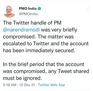 ਪ੍ਰਧਾਨ ਮੰਤਰੀ ਨਰਿੰਦਰ ਮੋਦੀ ਦਾ ਅਧਿਕਾਰਤ ਟਵਿੱਟਰ ਅਕਾਊਂਟ ਹੈਕ ਹੋ ਗਿਆ ਸੀ । ਹੈਕਰਾਂ ਨੇ ਬਿਟਕੁਆਇਨ ਨਾਲ ਸਬੰਧਤ ਟਵੀਟ ਵੀ ਕੀਤੇ ਹਨ। ਹਾਲਾਂਕਿ, ਇਸ ‘ਤੇ ਤੁਰੰਤ ਕਾਰਵਾਈ ਕੀਤੀ ਗਈ ਅਤੇ ਹੁਣ ਖਾਤਾ ਸੁਰੱਖਿਅਤ ਹੈ, ਇਹ ਜਾਣਕਾਰੀ ਪ੍ਰਧਾਨ ਮੰਤਰੀ ਦਫਤਰ ਨੇ ਦਿੱਤੀ ਹੈ। ਪੀਐਮਓ ਨੇ ਟਵੀਟ ਕਰਕੇ ਕਿਹਾ ਕਿ ਉਸ ਸਮੇਂ ਕੀਤੇ ਗਏ ਟਵੀਟ ਨੂੰ ਨਜ਼ਰਅੰਦਾਜ਼ ਕਰੋ। ਅਜੇ ਤਕ ਇਹ ਪਤਾ ਨਹੀਂ ਲੱਗ ਸਕਿਆ ਹੈ ਕਿ ਪ੍ਰਧਾਨ ਮੰਤਰੀ ਮੋਦੀ ਦਾ ਨਿੱਜੀ ਟਵਿਟਰ ਹੈਂਡਲ ਕਿੰਨਾ ਸਮਾਂ ਹੈਕਰਾਂ ਦੇ ਹੱਥਾਂ ‘ਚ ਰਿਹਾ।