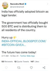 12 ਦਸੰਬਰ ਦੀ ਸਵੇਰੇ 2.11 ਵਜੇ, ਪ੍ਰਧਾਨ ਮੰਤਰੀ ਦੇ ਅਧਿਕਾਰਤ ਟਵਿੱਟਰ ਹੈਂਡਲ ਤੋਂ ਇਕ ਸਪੈਮ ਟਵੀਟ ਪੋਸਟ ਕੀਤਾ ਗਿਆ। ਟਵੀਟ ‘ਚ ਕਿਹਾ ਗਿਆ, ‘ਭਾਰਤ ਨੇ ਅਧਿਕਾਰਤ ਤੌਰ ‘ਤੇ ਬਿਟਕੁਆਇਨ ਨੂੰ ਕਾਨੂੰਨੀ ਮਨਜ਼ੂਰੀ ਦੇ ਦਿੱਤੀ ਹੈ। ਸਰਕਾਰ ਨੇ ਅਧਿਕਾਰਤ ਤੌਰ ‘ਤੇ 500 ਬਿਟਕੁਆਇਨ ਖਰੀਦੇ ਹਨ ਅਤੇ ਇਸ ਨੂੰ ਦੇਸ਼ ਦੇ ਸਾਰੇ ਨਾਗਰਿਕਾਂ ‘ਚ ਵੰਡ ਰਹੀ ਹੈ। ਜਲਦੀ ਕਰੋ ਇੰਡੀਆ… ਭਵਿੱਖ ਅੱਜ ਆਇਆ ਹੈ!’