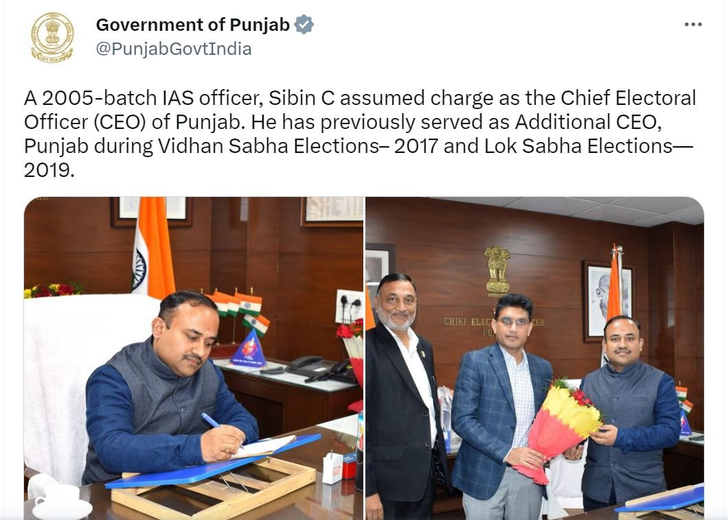 ਆਈਏਐਸ ਅਧਿਕਾਰੀ ਸਿਬਿਨ ਸੀ (IAS officer Sibin C) ਨੇ ਬੁੱਧਵਾਰ ਨੂੰ ਪੰਜਾਬ ਦੇ ਮੁੱਖ ਚੋਣ ਅਧਿਕਾਰੀ (Chief Electoral Officer) (CEO) ਵਜੋਂ ਅਹੁਦਾ ਸੰਭਾਲ ਲਿਆ ਹੈ। 2005 ਬੈਚ ਦੇ ਅਧਿਕਾਰੀ ਨੇ 2017 ਦੀਆਂ ਵਿਧਾਨ ਸਭਾ ਚੋਣਾਂ ਅਤੇ 2019 ਦੀਆਂ ਲੋਕ ਸਭਾ ਚੋਣਾਂ ਦੌਰਾਨ ਪੰਜਾਬ ਦੇ ਵਧੀਕ ਸੀ.ਈ.ਓ. (Additional CEO) ਵਜੋਂ ਵੀ ਸੇਵਾਵਾਂ ਨਿਭਾਅ ਚੁੱਕੇ ਹਨ।