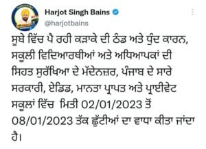 ਛੁੱਟੀਆਂ ਤੋਂ ਬਾਅਦ ਸਕੂਲਾਂ ਨੂੰ ਲੈਕੇ ਸਿੱਖਿਆ ਮੰਤਰੀ ਨੇ ਅਹਿਮ ਫੈਸਲਾ ਲਿਆ ਹੈ। ਦਸ ਦਈਏ ਕਿ ਮੌਸਮ ਦੇ ਖ਼ਰਾਬ ਹੋਣ ਦੇ ਮੱਦੇਨਜ਼ਰ ਅਤੇ ਪੰਜਾਬ ’ਚ ਪੈ ਰਹੀ ਕੜਾਕੇ ਦੀ ਠੰਡ ਅਤੇ ਧੁੰਦ ਕਾਰਨ ਪੰਜਾਬ ਸਰਕਾਰ ਨੇ ਸਕੂਲਾਂ ਦੀਆਂ ਛੁੱਟੀਆਂ ’ਚ ਵਾਧਾ ਕਰ ਦਿੱਤਾ ਹੈ। ਇਸ ਸਬੰਧੀ ਸਿੱਖਿਆ ਮੰਤਰੀ ਹਰਜੋਤ ਸਿੰਘ ਬੈਂਸ ਨੇ ਸੋਸ਼ਲ ਮੀਡੀਆ ’ਤੇ ਪੋਸਟ ਪਾ ਕੇ ਜਾਣਕਾਰੀ ਦਿੱਤੀ। ਉਹਨਾਂ ਕਿਹਾ ਕਿ ਸੂਬੇ ’ਚ ਪੈ ਰਹੀ ਕੜਾਕੇ ਦੀ ਠੰਡ ਅਤੇ ਧੁੰਦ ਕਾਰਨ ਸਕੂਲੀ ਵਿਦਿਆਰਥੀਆਂ ਅਤੇ ਅਧਿਆਪਕਾਂ ਦੀ ਸਿਹਤ ਸੁਰੱਖਿਆ ਦੇ ਮੱਦੇਨਜ਼ਰ ਪੰਜਾਬ ਦੇ ਸਾਰੇ ਸਰਕਾਰੀ, ਏਡਿਡ, ਮਾਨਤਾ ਪ੍ਰਾਪਤ ਅਤੇ ਪ੍ਰਾਈਵੇਟ ਸਕੂਲਾਂ ’ਚ 2 ਜਨਵਰੀ 2023 ਤੋਂ 8 ਜਨਵਰੀ 2023 ਤੱਕ ਛੁੱਟੀਆਂ ਦਾ ਵਾਧਾ ਕੀਤਾ ਜਾਂਦਾ ਹੈ।