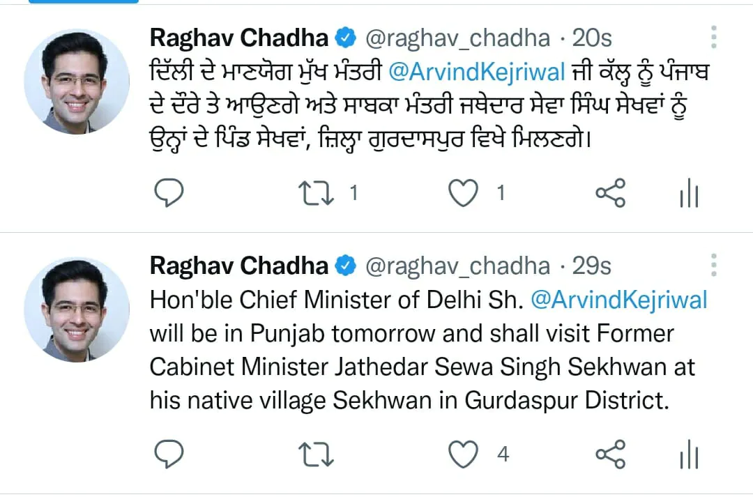 ਇਹ ਜਾਣਕਾਰੀ ਆਪ ਆਗੂ ਰਾਘਵ ਚੱਢਾ ਨੇ ਟਵੀਟ ਕਰਕੇ ਸਾਂਝੀ ਕੀਤੀ ਹੈ। ਦੱਸਿਆ ਜਾ ਰਿਹਾ ਹੈ ਕਿ ਇਸ ਦੌਰਾਨ ਸੇਵਾ ਸਿੰਘ ਸੇਖਵਾਂ ਆਪ ਵਿਚ ਸ਼ਾਮਲ ਹੋਣਗੇ।