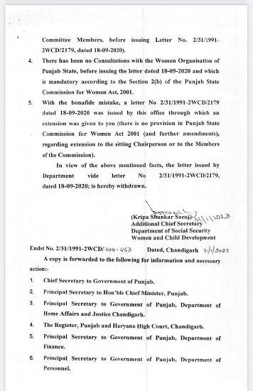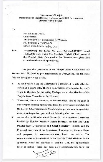 ਇਸ ਨੂੰ ਲੈਕੇ ਪੰਜਾਬ ਦੇ ਸੋਸ਼ਲ ਸਕਿਓਰਿਟੀ ਵੁਮੈਨ ਅਤੇ ਚਾਈਲਡ ਵਿਭਾਗ ਵਲੋਂ ਇਕ ਨੋਟੀਫਿਕੇਸ਼ਨ ਵੀ ਜਾਰੀ ਕੀਤਾ ਗਿਆ ਹੈ ਜਿਸ ਵਿਚ ਉਹਨਾਂ ਨੇ ਇਹ ਜਾਣਕਾਰੀ ਦਿੱਤੀ ਹੈ ਕਿ ਸਵਿਧਾਨ ਮੁਤਾਬਕ, ਚੇਅਰਪਰਸਨ ਦਾ ਕਾਰਜਕਾਲ ਸਿਰਫ 3 ਸਾਲ ਤੱਕ ਦਾ ਹੁੰਦਾ ਹੈ ਅਤੇ ਇਸ ਕਾਰਜਕਾਰਲ ਨੂੰ ਵਧਾਇਆ ਨਹੀਂ ਜਾ ਸਕਦਾ। ਹਾਲਾਂਕਿ, ਜਾਣਕਾਰੀ ਅਨੁਸਾਰ ਪੰਜਾਬ ਸਰਕਾਰ ਨੇ 18-9-2020 ਨੂੰ ਮਨੀਸ਼ਾ ਗੁਲਾਟੀ ਦੀ ਟਰਮ ‘ਚ 3 ਸਾਲਾਂ ਦਾ ਵਾਧਾ ਕਰ ਦਿੱਤਾ ਸੀ, ਪਰ ਅੱਜ ਜੋ ਸੋਸ਼ਲ ਸਕਿਓਰਿਟੀ ਵੁਮੈਨ ਅਤੇ ਚਾਈਲਡ ਵਿਭਾਗ ਵੱਲੋਂ ਹੁਕਮ ਜਾਰੀ ਕੀਤੇ ਗਏ ਹਨ ਉਹਨਾਂ ਅਨੁਸਾਰ ਇਸ ਵਾਧੇ ਦੀ ਸਰਕਾਰੀ ਨਿਯਮਾਂ ‘ਚ ਕੋਈ ਵਿਵਸਥਾ ਨਹੀਂ ਸੀ। ਇਸ ਕਾਰਨ ਉਨ੍ਹਾਂ ਨੂੰ ਚੇਅਰਪਰਸਨ ਬਣਾਉਣ ਦੇ ਹੁਕਮ ਵਾਪਸ ਲੈ ਲਏ ਗਏ ਹਨ। ਇਸ ਸਬੰਧੀ ਲਿਖ਼ਤੀ ਆਰਡਰਾ ਦੀ ਕਾਪੀ ਮੀਡੀਆ ਨੂੰ ਪ੍ਰਾਪਤ ਹੋਈ ਹੈ।