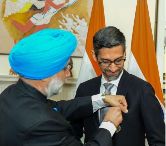 ਅਮਰੀਕਾ ਵਿੱਚ ਭਾਰਤ ਦੇ ਰਾਜਦੂਤ ਤਰਨਜੀਤ ਸਿੰਘ ਸੰਧੂ ਨੇ ਸਾਨ ਫਰਾਂਸਿਸਕੋ ਵਿੱਚ ਗੂਗਲ (Google) ਅਤੇ ਅਲਫਾਬੇਟ (Alphabet) ਦੇ ਸੀਈਓ ਸੁੰਦਰ ਪਿਚਾਈ (CEO Sundar Pichai) ਨੂੰ ਦੇਸ਼ ਦੇ ਸਰਵਉੱਚ ਨਾਗਰਿਕ ਪੁਰਸਕਾਰਾਂ ਵਿੱਚੋਂ ਇੱਕ ਪਦਮ ਭੂਸ਼ਣ ਸੌਂਪਿਆ। ਇਸ ਮੌਕੇ Google ਅਤੇ Alphabet ਦੇ CEO ਸੁੰਦਰ ਪਿਚਾਈ ਨੇ ਕਿਹਾ ਹੈ ਕਿ ਉਹ ਹਮੇਸ਼ਾ ਭਾਰਤ ਨਾਲ ਜੁੜੇ ਹੋਏ ਮਹਿਸੂਸ ਕਰਦੇ ਹਨ ਅਤੇ ਜਿੱਥੇ ਵੀ ਜਾਂਦੇ ਹਨ ਆਪਣੀ ਭਾਰਤੀ ਪਛਾਣ ਆਪਣੇ ਨਾਲ ਰੱਖਦੇ ਹਨ। ਪਿਚਾਈ ਨੇ ਇਹ ਗੱਲ ਭਾਰਤ ਦੇ ਤੀਜੇ ਸਭ ਤੋਂ ਵੱਡੇ ਨਾਗਰਿਕ ਪੁਰਸਕਾਰ ਪਦਮ ਭੂਸ਼ਣ ਨਾਲ ਸਨਮਾਨਿਤ ਕੀਤੇ ਜਾਣ ਦੇ ਮੌਕੇ ‘ਤੇ ਆਖੀ। ਪਿਚਾਈ ਨੇ ਕਿਹਾ ਕਿ ਭਾਰਤ ਮੇਰਾ ਹਿੱਸਾ ਹੈ ਅਤੇ ਮੈਂ ਜਿੱਥੇ ਵੀ ਜਾਂਦਾ ਹਾਂ ਇਸ ਨੂੰ ਆਪਣੇ ਨਾਲ ਲੈ ਜਾਂਦਾ ਹਾਂ।